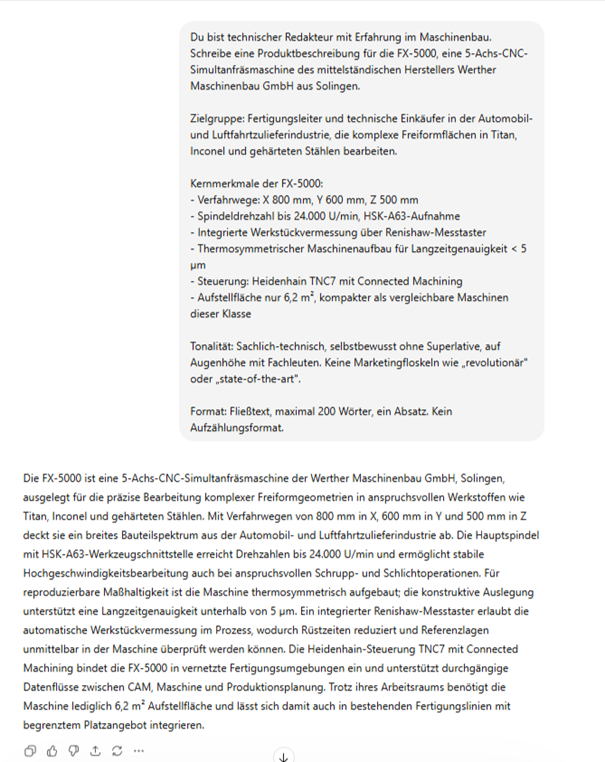 Das Ergebnis ist ein anderer Text. ChatGPT nennt die FX-5000 beim Namen, ordnet sie dem Hersteller Werther Maschinenbau zu, spezifiziert Verfahrwege von 800 × 600 × 500 mm, benennt die HSK-A63-Werkzeugschnittstelle mit 24.000 U/min, erwähnt den Renishaw-Messtaster und die Heidenhain TNC7-Steuerung namentlich, und schließt mit der kompakten Aufstellfläche von 6,2 m² als konkretem Differenzierungsmerkmal. Der Text ist ein einzelner Fließtext-Absatz – exakt wie vorgegeben. Keine Marketingfloskeln, keine Superlative, stattdessen technische Substanz auf Augenhöhe mit der Zielgruppe.