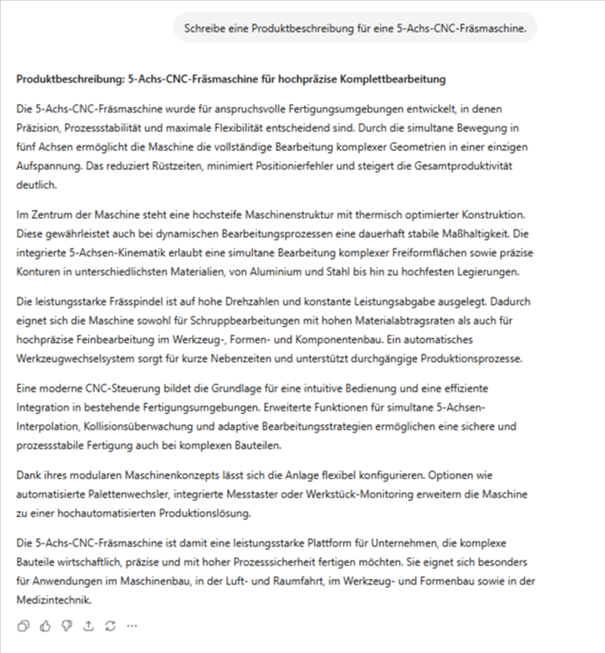 Das Problem: Diese Beschreibung passt auf jede beliebige 5-Achs-Fräsmaschine der Welt. Kein Produktname, kein Hersteller, keine konkreten Verfahrwege, keine Spindeldaten, keine benannte Steuerung. Stattdessen Phrasen wie „maximale Flexibilität" und „leistungsstarke Frässpindel" – Aussagen, die ein Fertigungsleiter im Einkaufsprozess nicht einmal zur Kenntnis nehmen würde, weil sie null Differenzierung bieten. Das Format hat ChatGPT eigenmächtig als gegliederten Mehrabsatz-Text mit Zwischenüberschrift angelegt – danach wurde nicht gefragt, es entsprach schlicht dem Standardmuster des Modells.